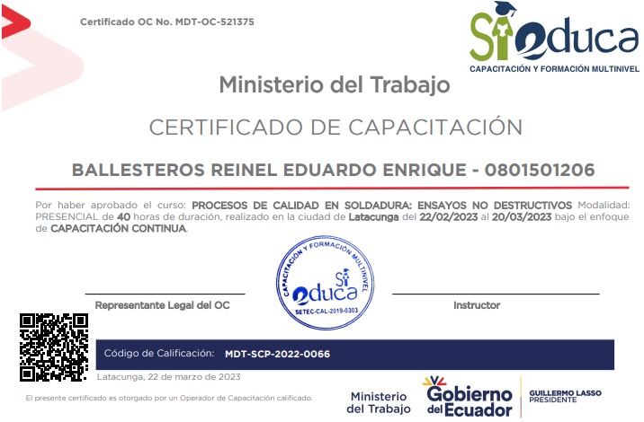 Con registro en SUBSECRETARÍA DE CUALIFICACIONES PROFESIONALES Y GESTIÓN ARTESANAL – SCPGA y visualización en la SENESCYT